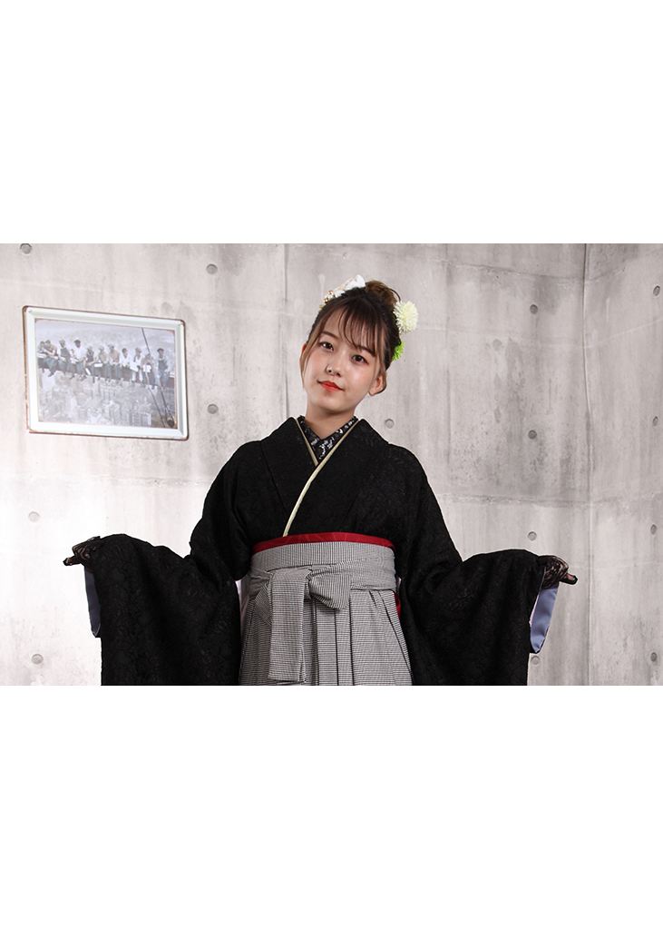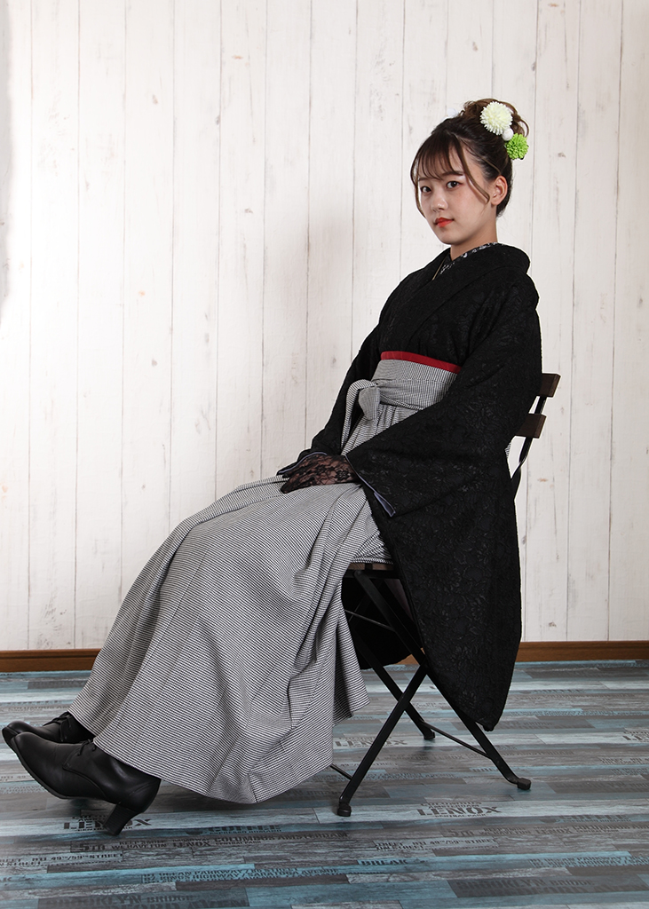 シンプルに見える着物もレーシーな素材を重ね合わせ、袴の格子調との相性が凄く良い。