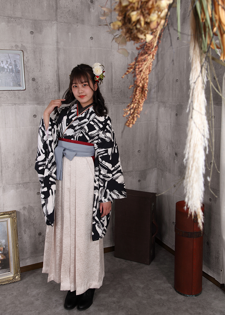 幾何学模様の黒と白のコントラストの着物にジャガード織で織り込まれた花柄の袴を合わせることで大人綺麗な女子に似合うスタイル。着る人の個性によって何重にも着こなせる、そんな綺麗系女子になれる袴姿です。