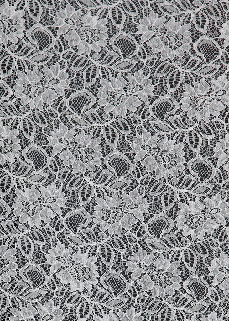 全身レース柄で重くなりがちな表情を、襟元に施したエンブロイダリーレースが引き締める。