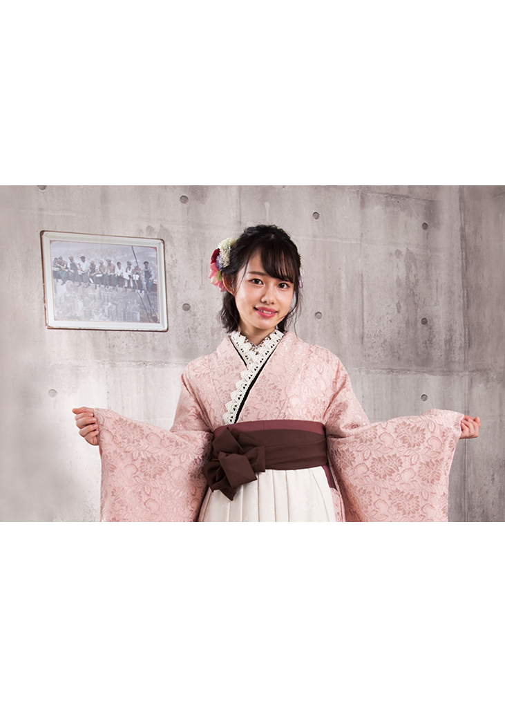 袴には柔らかな矢車草を取り入れて、全体的にふんわりとした優しい雰囲気を醸し出す(かもしだす)。