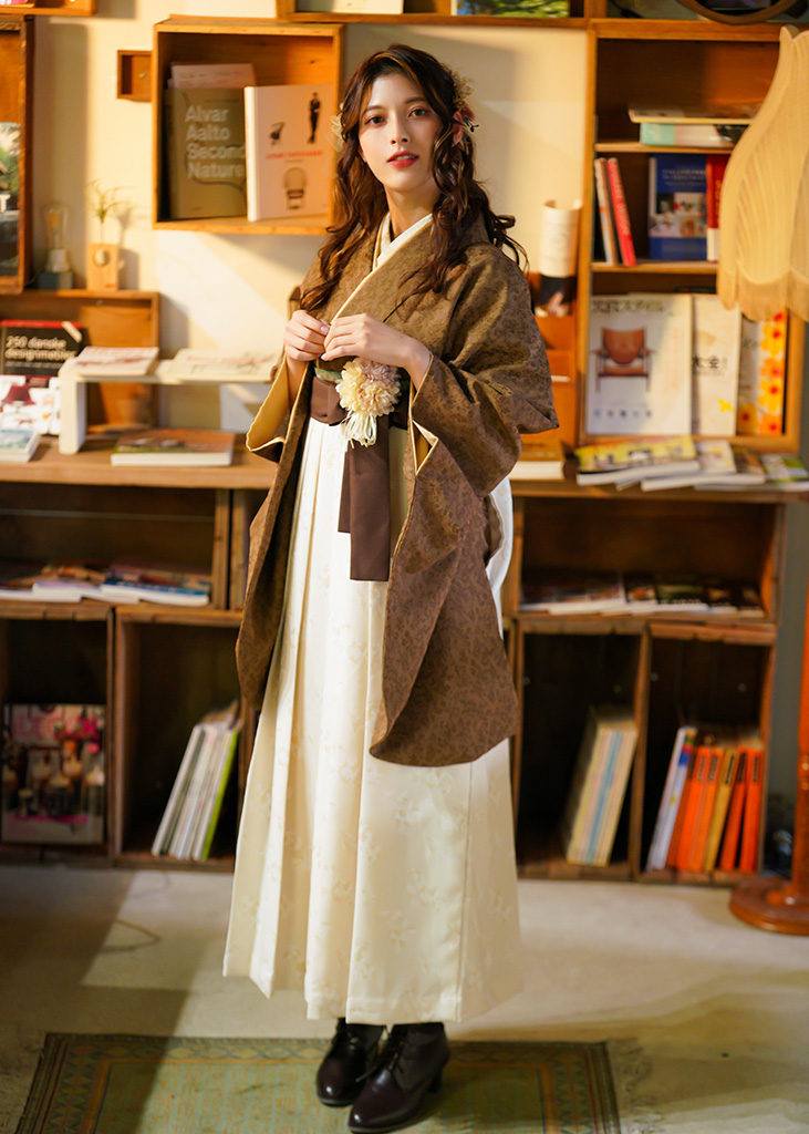 焦げ茶地に小花たちで濃淡を彩った宝石の様な着物。袴はベージュにヨーロピアン調の花をあしらい、全体に統一感を出す姿に仕上げました。引き締めに使ったターコイズブルーでシックになりすぎない大人女子の装いに。